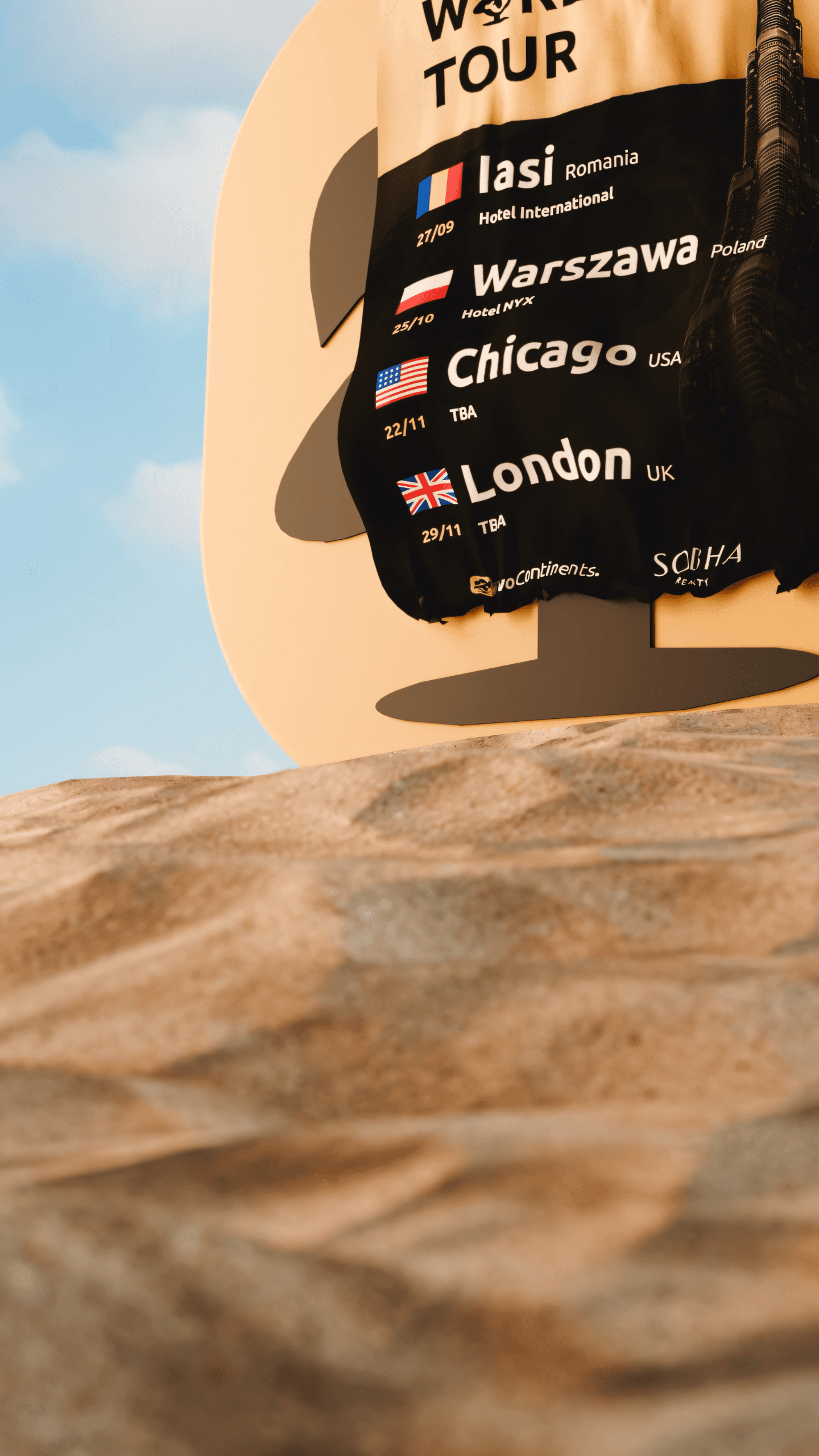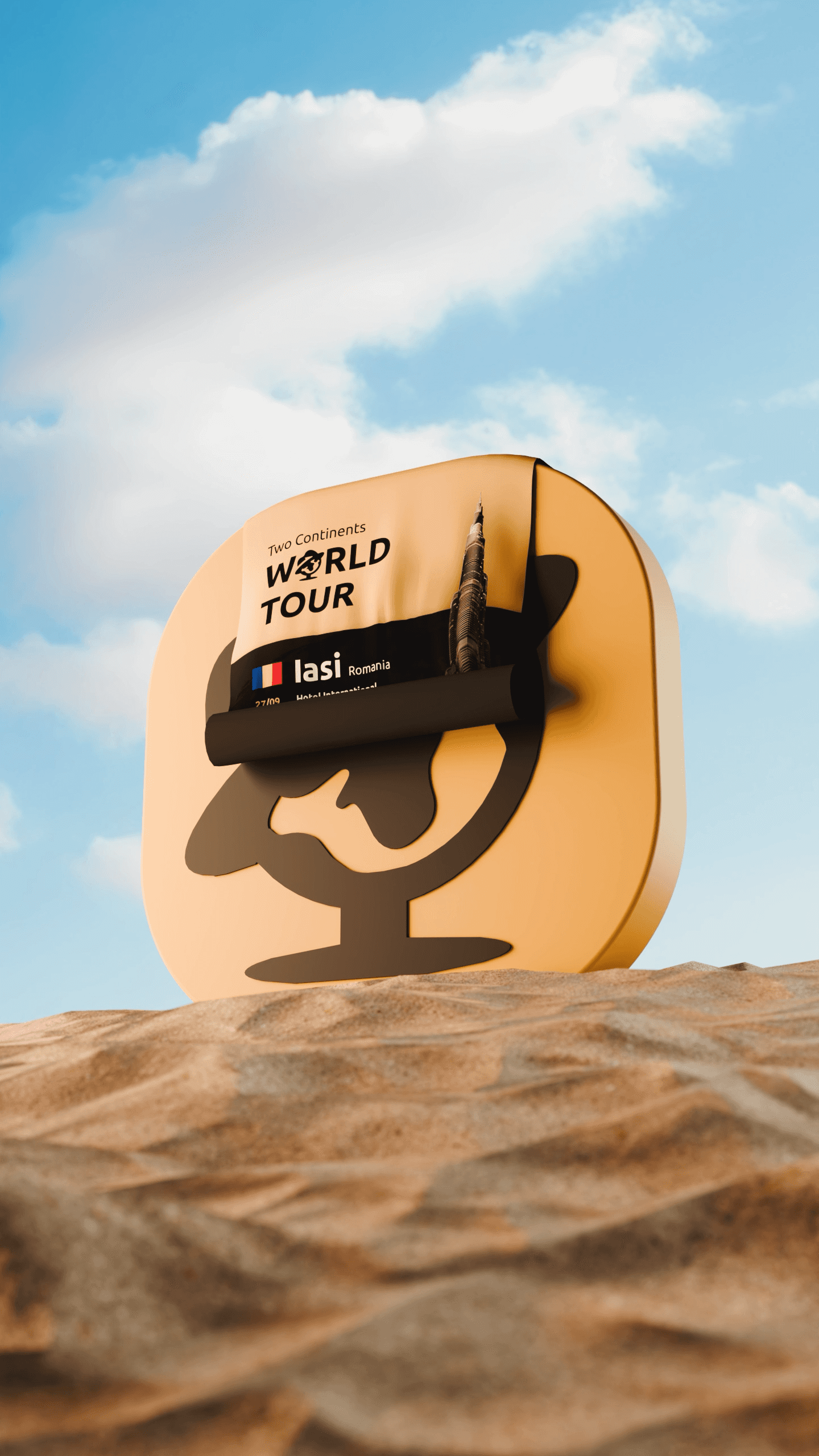 The idea was simple: let the brand speak for itself. The animation opens on the Two Continents logo standing alone in a desert landscape, then the poster peels away from it, as if the event was always hidden inside the identity. The 3D environment adds weight and drama to what could have been a static announcement, turning a list of dates into a cinematic reveal. Every detail, the sandy terrain, the sky, the curl of the poster, was crafted to feel polished and travel-ready.