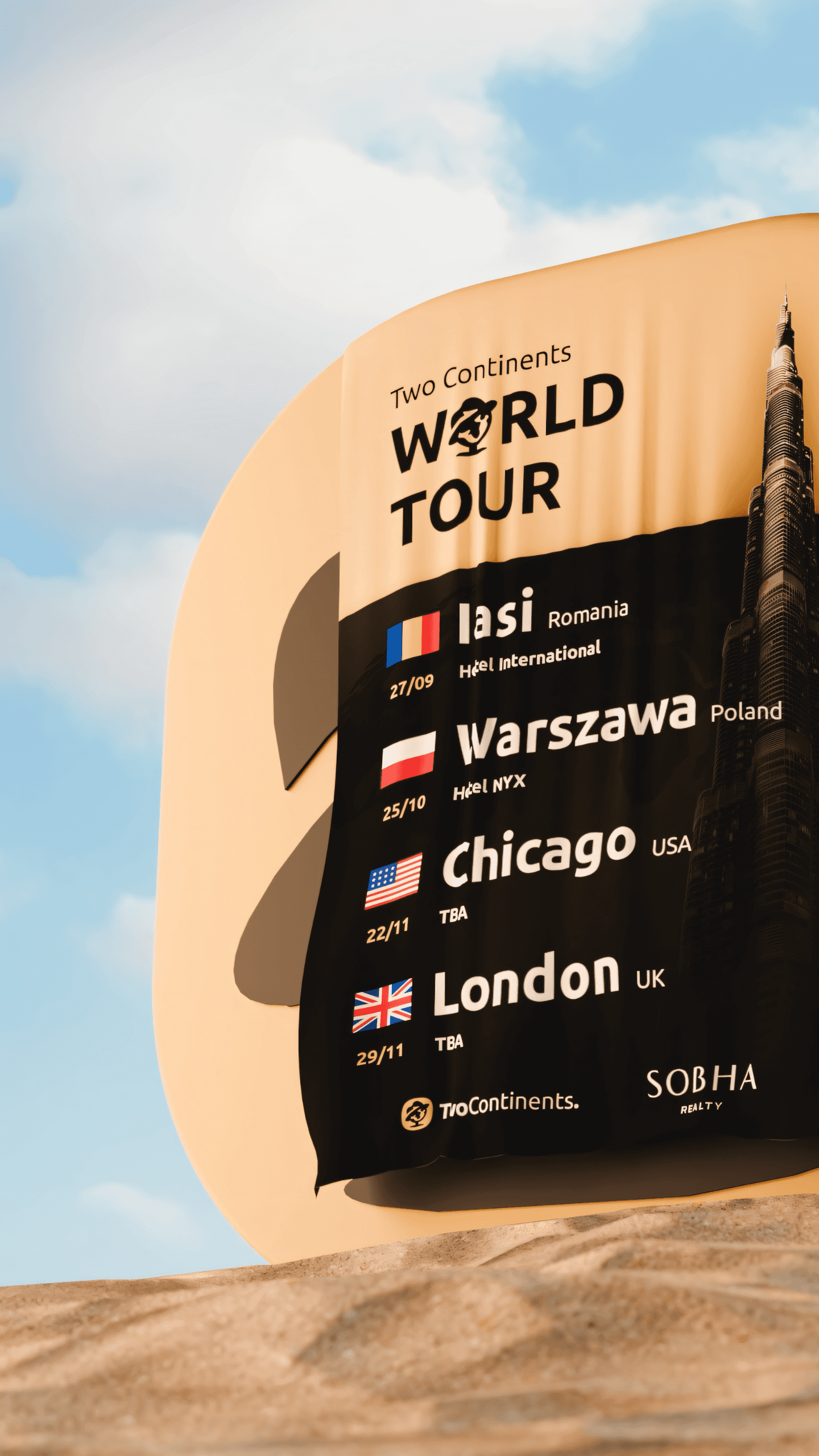 A 3D animation created for Two Continents' World Tour event series. The concept revolves around a single, seamless shot, a poster slowly unfurling from the brand's iconic logo, revealing each tour stop one by one. The tour took place across four cities: Iași, Warsaw, Chicago, and London. Built to grab attention across social media and drive event awareness.