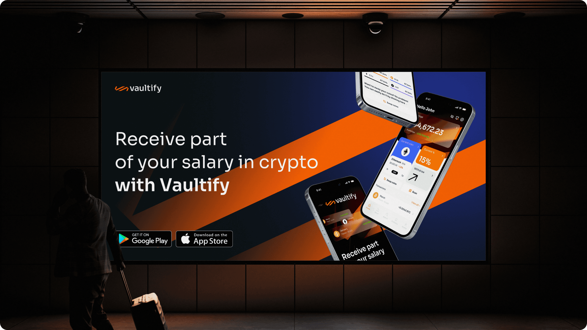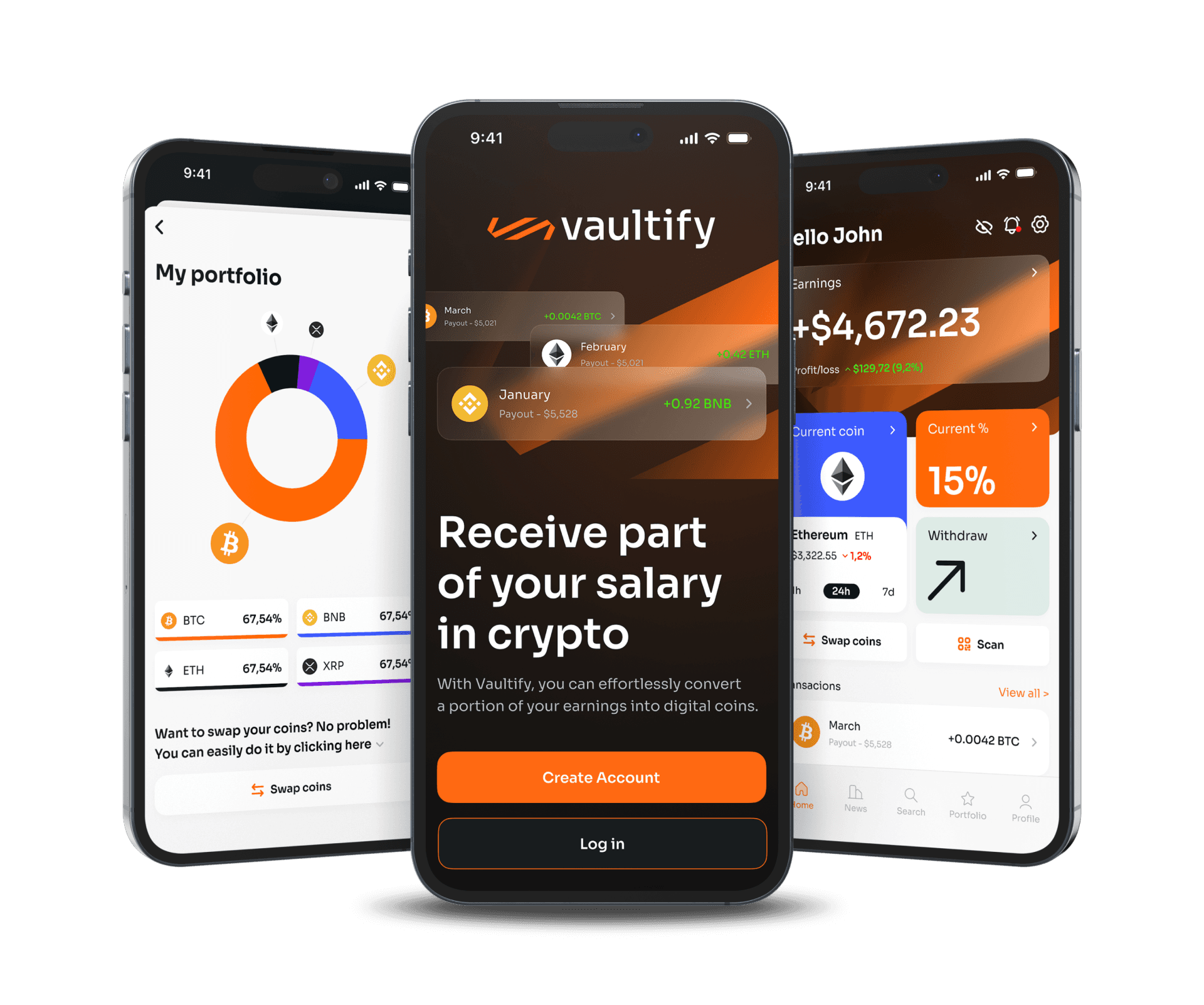 Vaultify is a concept fintech app that lets users receive a portion of their salary directly in cryptocurrency, making everyday investing effortless and automatic. The goal was to design a brand and product that feels both trustworthy and forward,thinking, bridging the gap between traditional payroll and the crypto economy.