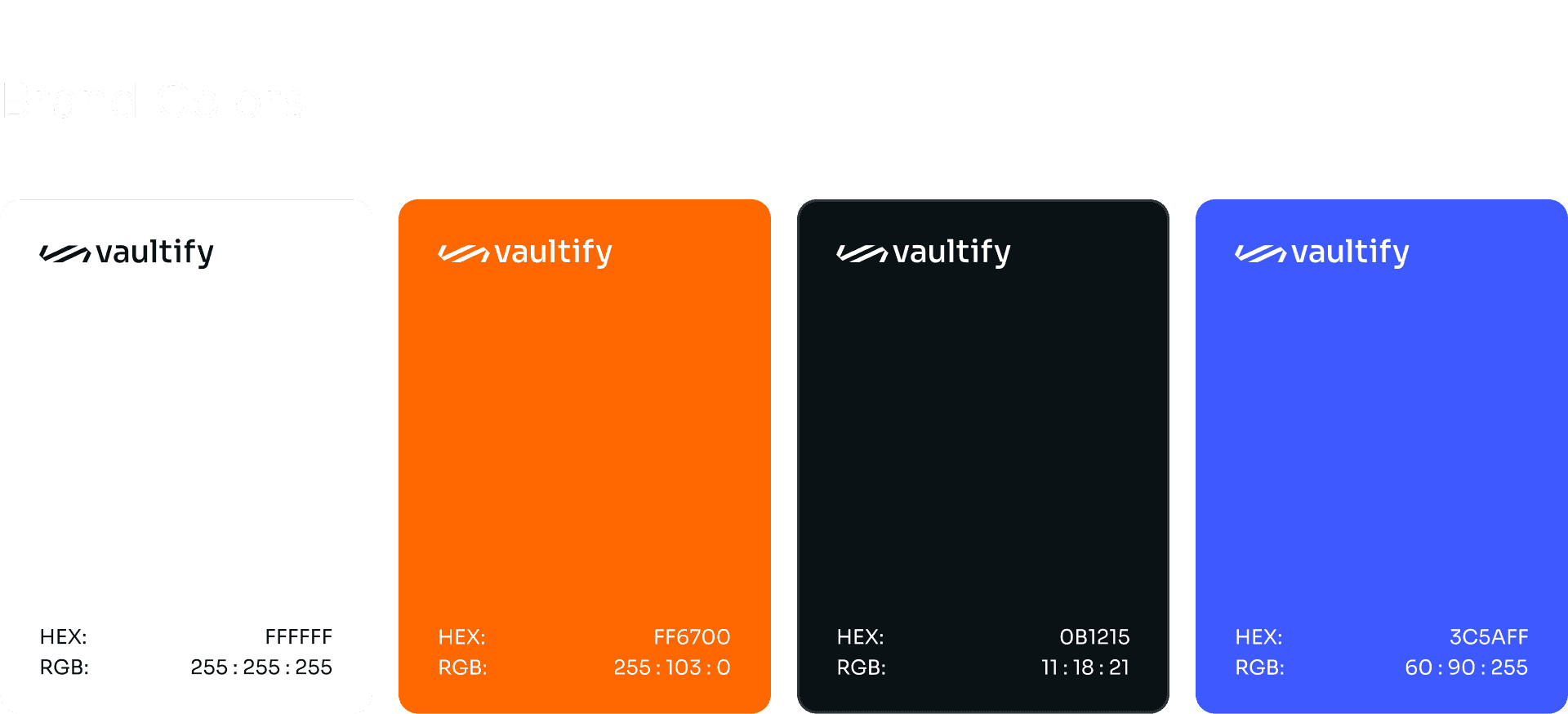 The visual identity was built around the idea of momentum and growth. The logomark, a dynamic and angular symbol, communicates speed and direction, reflecting how Vaultify moves your money forward. A bold orange signals energy and opportunity, paired with deep navy and electric blue to ground the brand in trust and technology. Sora was chosen as the typeface for its clean, geometric character that feels modern without sacrificing readability.
